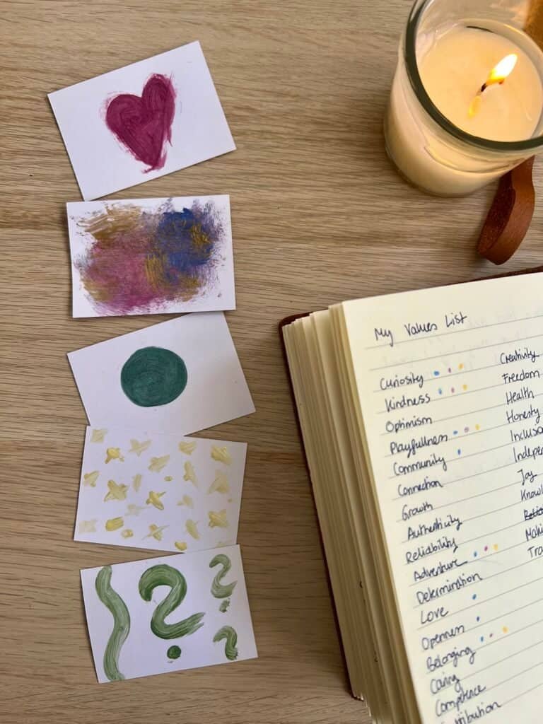 - Create value cards: For each value, write definitions and behaviours on an index card or small piece of paper. Add a drawing or visual representation on the other side.